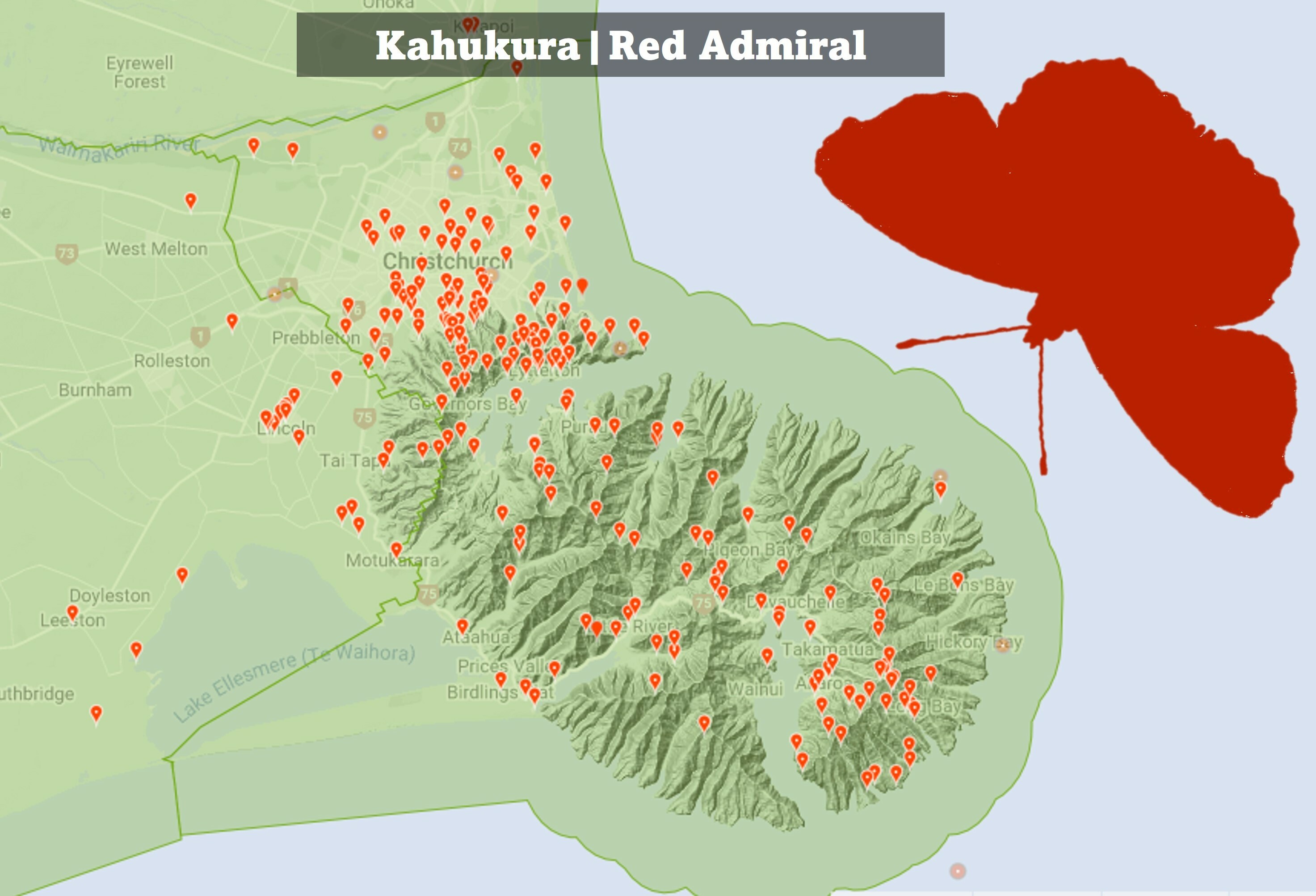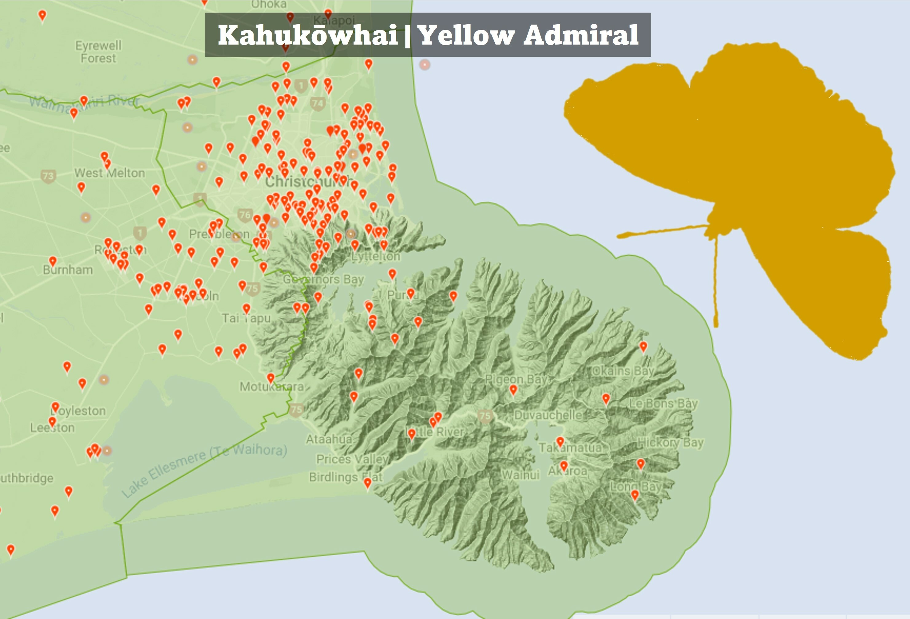 These days you're just as likely to spot either, as the kahukōwhai has become far more common. Our endemic kahukura is still sighted more frequently on Banks Peninsula as Cornes suggested in 1924, but the kahukōwhai is abundant in more built-up areas. The most likely explanation for this is that while the kahukōwhai may feed on introduced nettle species as well as our endemic tree nettle ongaonga (Urtica ferox), the kahukura is reliant on ongaonga alone. Ongaonga is far less common in Canterbury nowadays but retains a presence on Banks Peninsula.