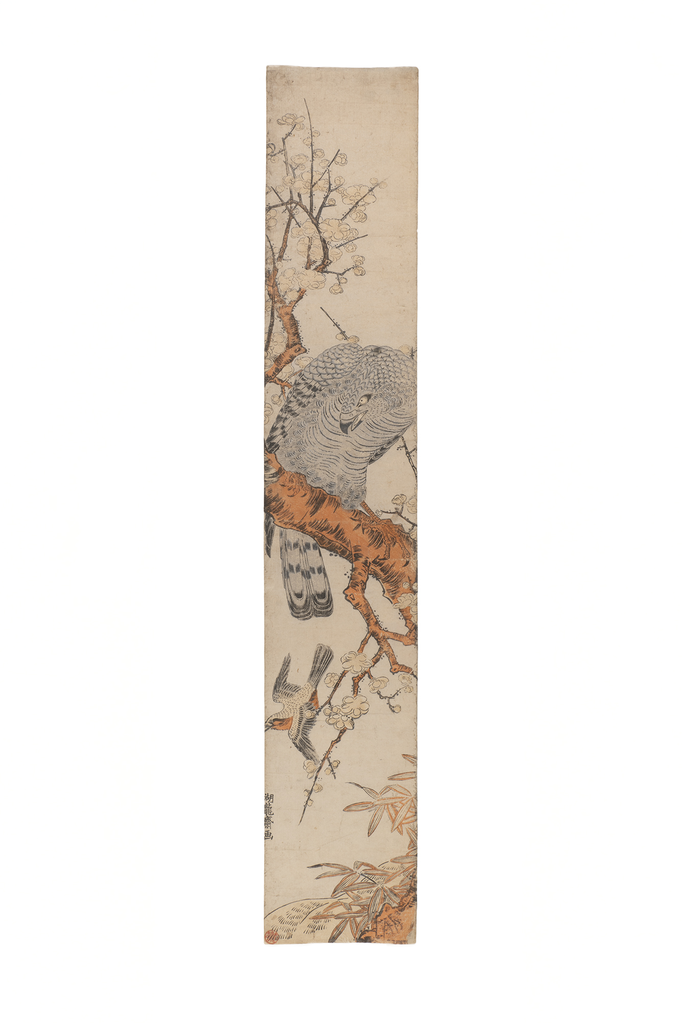 This pillar print (hashira-e) draws heavily from Chinese painting conventions, in both composition and subject. It depicts a hawk perched on a plum tree, eyeing up the bird flying below.