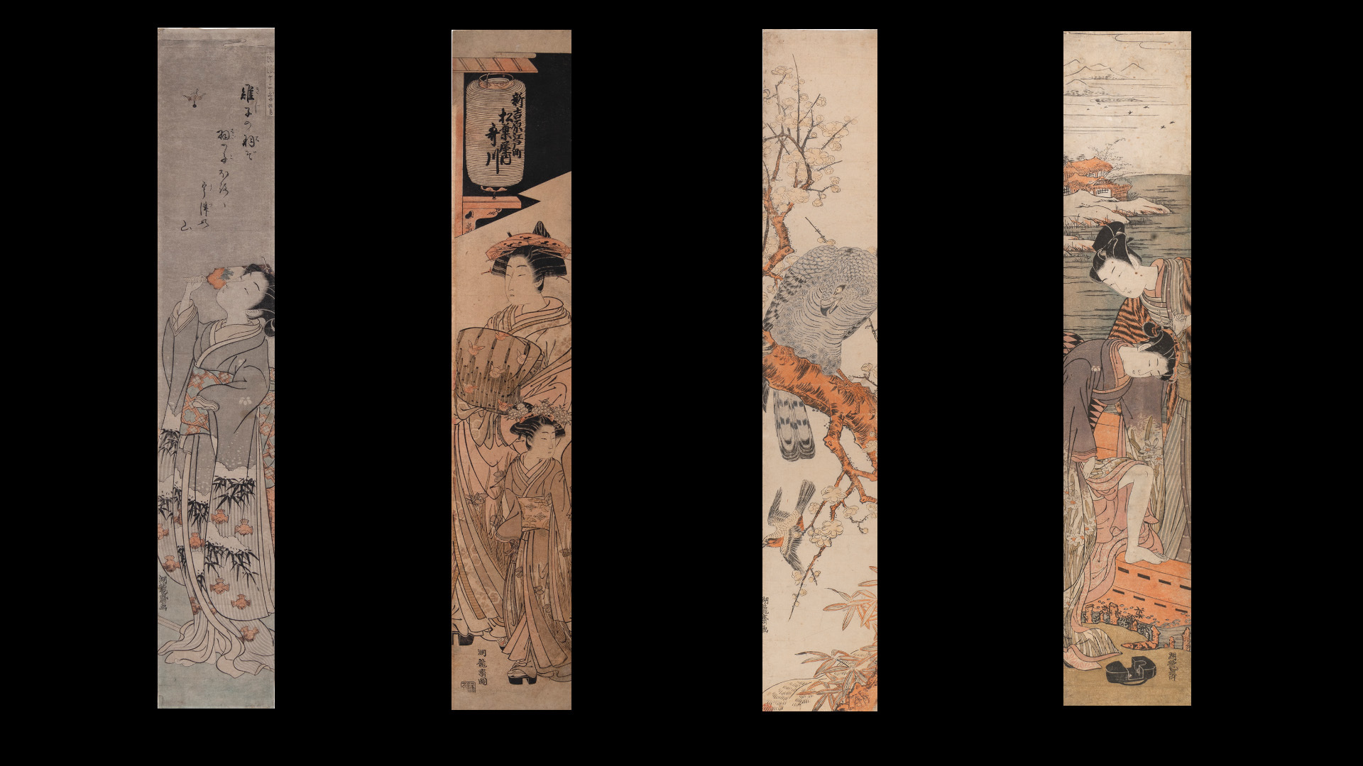 The pillar print has been called the most unique innovation within ukiyo-e, due to its very narrow width. It was the narrowest of the Edo period prints. This posed an exciting compositional challenge to ukiyo-e artists. Printing the artworks was also a challenge. Two woodblocks are joined together lengthwise to create the pillar print. The join of the boards would have been filed down, so that it was invisible on the print. The join can still be seen in some prints, but not in our four pillar prints.