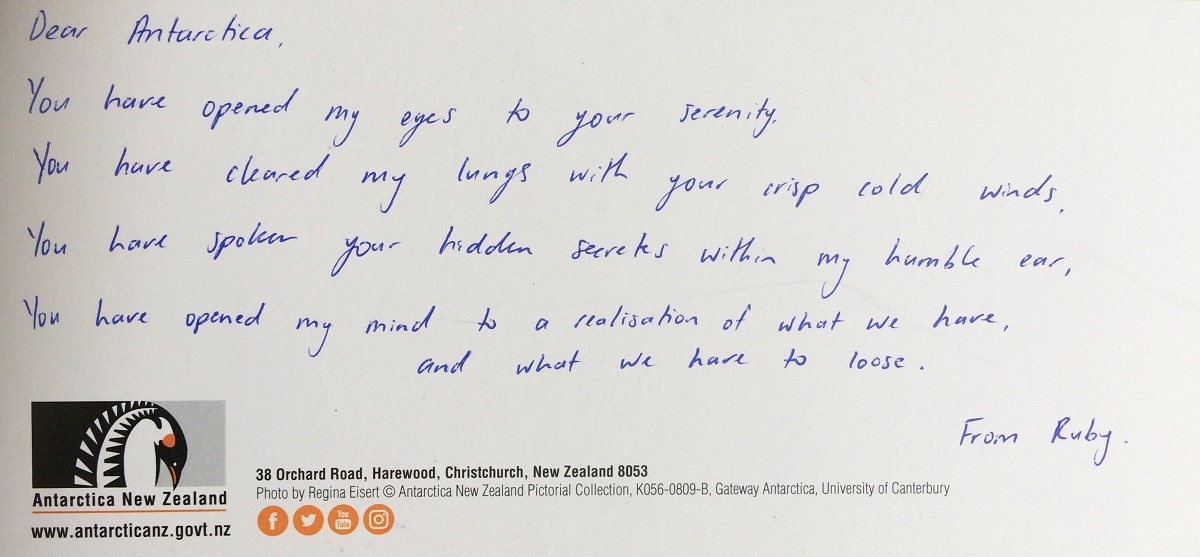 “Writing a postcard TO Antarctica may not be as strange as it seems,” says Guy. “Consider Te Urewera and the Whanganui River, both of which have been granted legal personhood status. That idea is really at the heart of my work – regarding the places in our lives as a person that we have a relationship with, someone that impacts on our lives and who deserves the same respect and justice that we all desire.