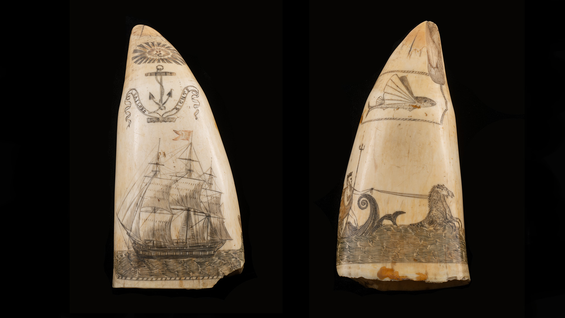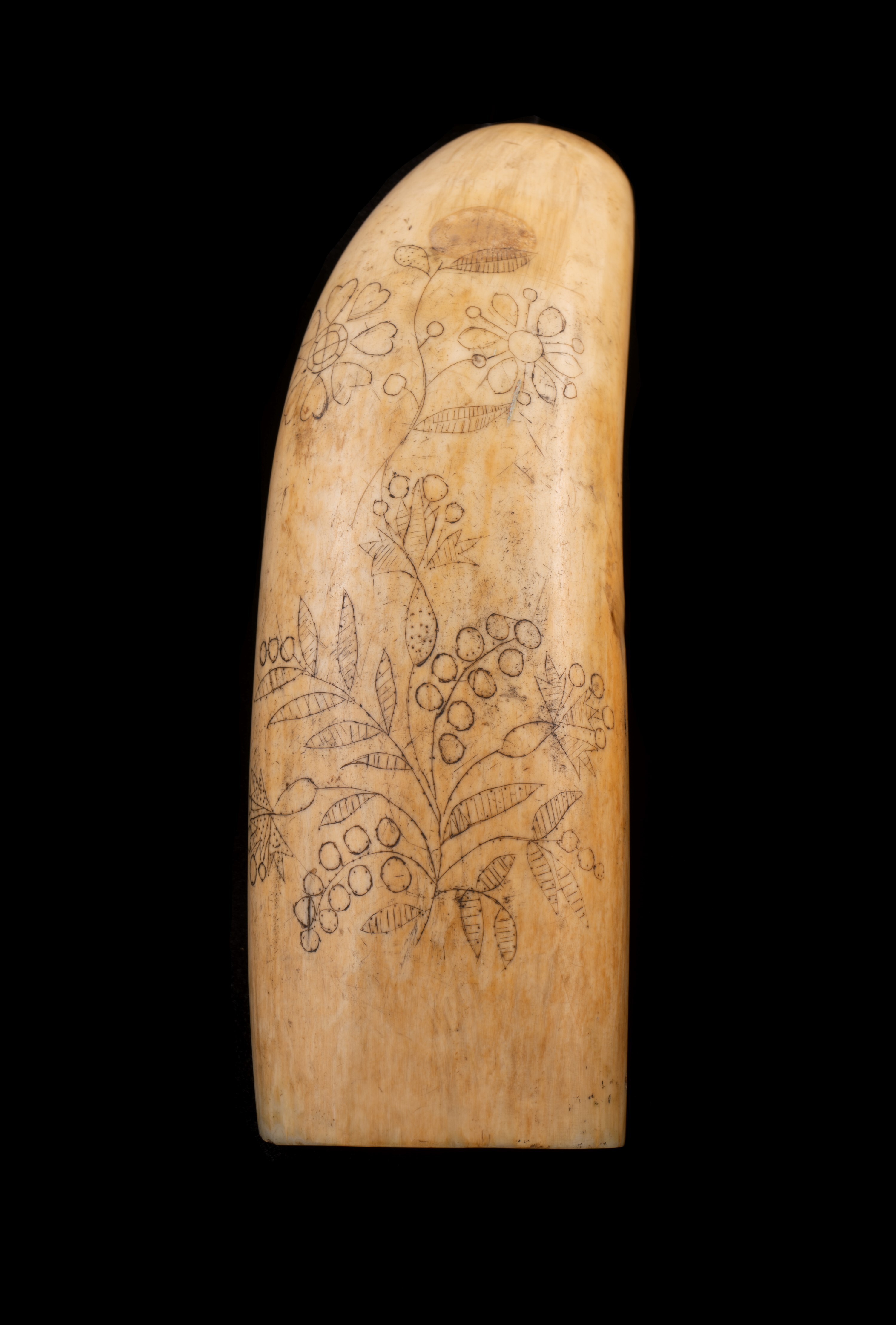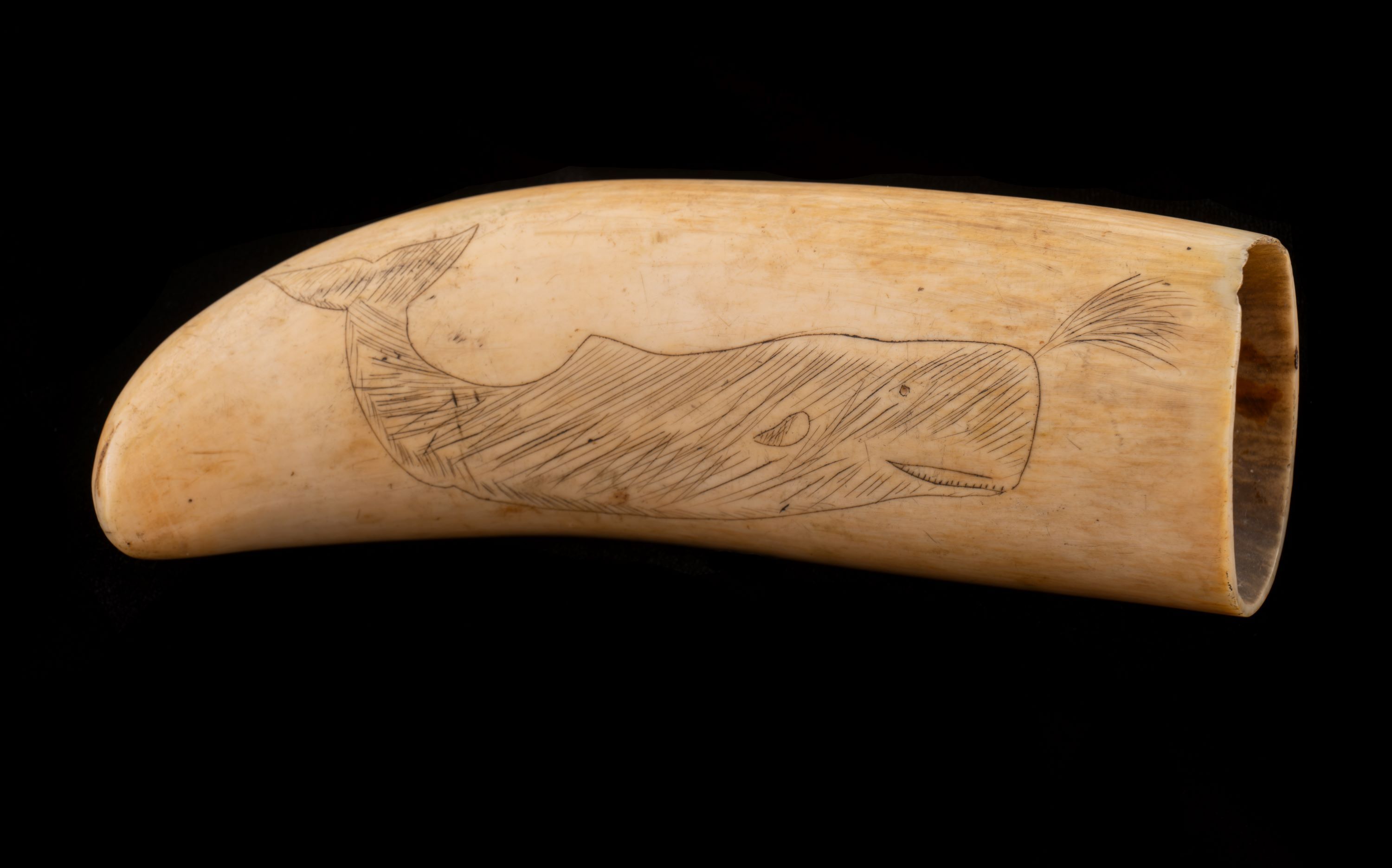 Sailors would use their knives to carve artworks featuring tall ships, rowing boats, whales, flowers and mythical creatures into the whale teeth. Then they would rub soot or any dark powder across the carving to make it stand out in black. People that practiced this art were known as scrimshanders. The art form thrived from the 1810s through to its peak in the 1830s and 1840s.