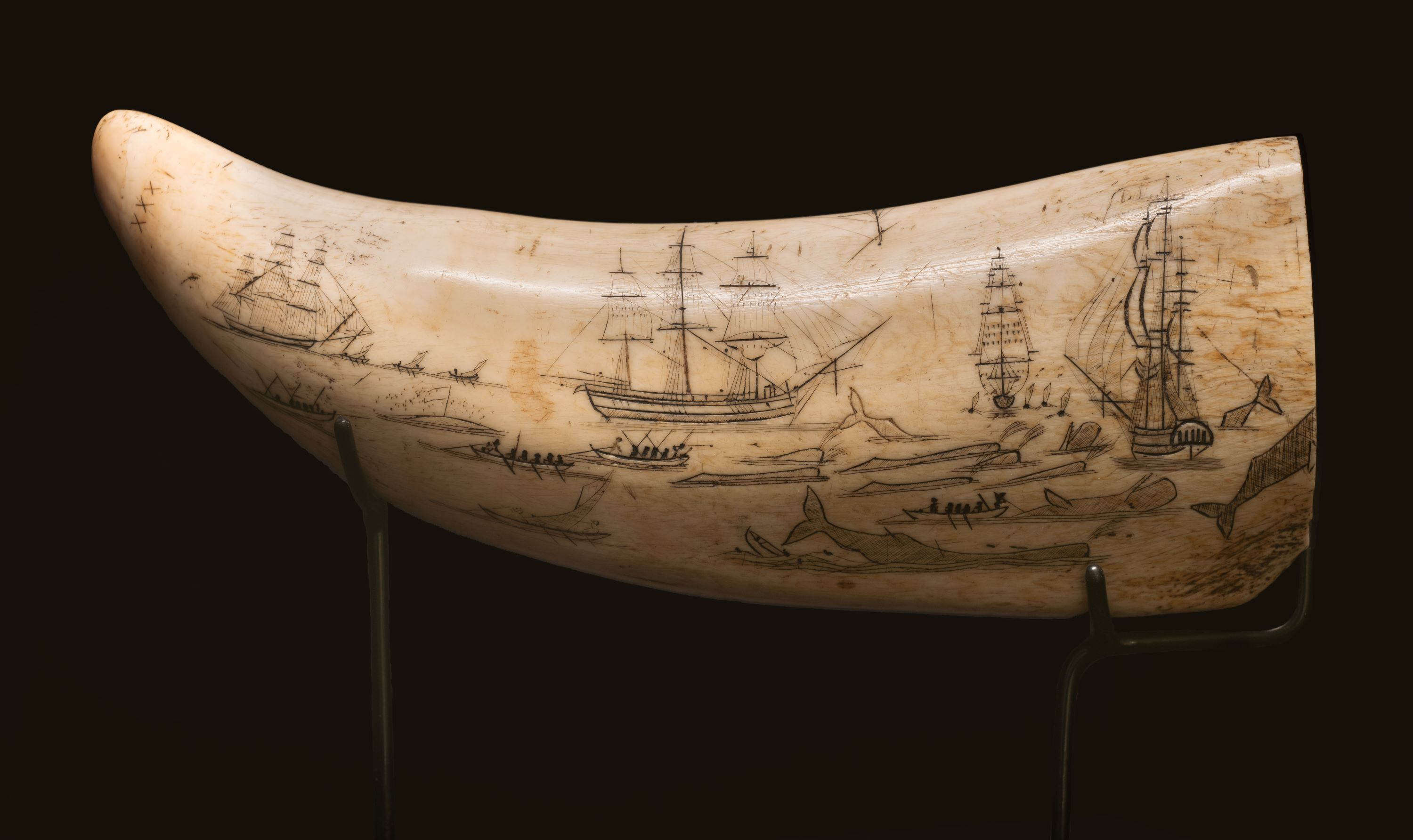 One scrimshaw work in the Canterbury Museum collection depicts a monstrous scene from the life of a whaler. It shows a cluster of tall ships and rowing boats engaged in the terrible struggle of killing whales and pulling them from the ocean. Four tall ships surround about 15 sperm whales, while 11 rowing boats head out to tackle them. Some whales float dead on the surface, others thrash and struggle. One rowing boat has been destroyed, its occupants thrown into the cold ocean.