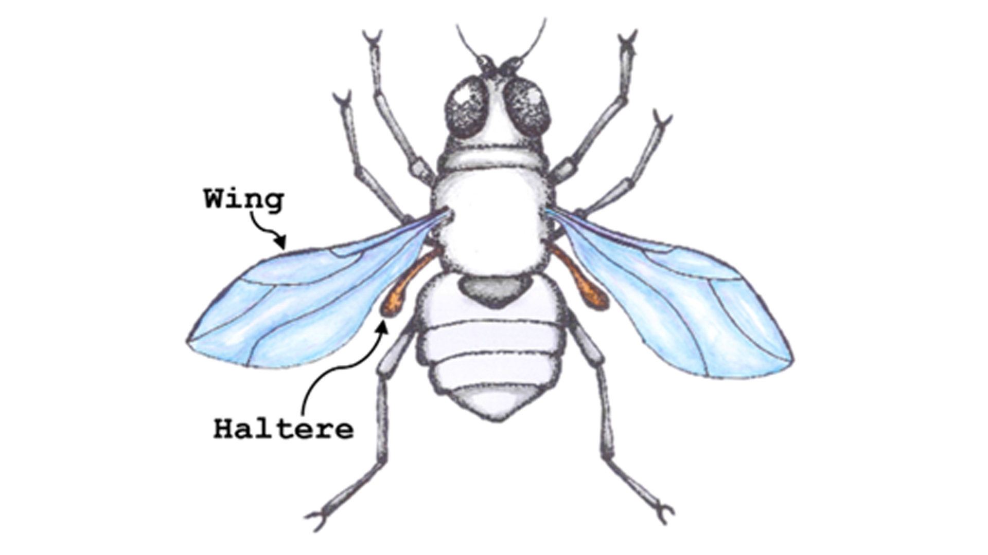 The name Diptera literally means two-winged. This is a defining trait that separates flies from other insect groups like Lepidoptera (moths and butterflies) and Hymenoptera (ants, bees, and wasps). Instead of having four wings (a pair on each side) like a butterfly or bee, flies have just two wings, and their hind wing is reduced to something called a haltere which looks like a tiny drumstick sitting just behind their forewings (see diagram below).