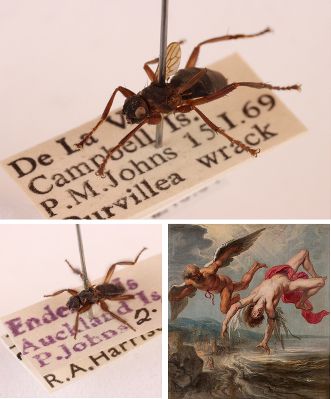 In the Museum collection, we have several examples of these flies collected from the Subantarctic Islands. There are two flightless species in the kelp fly family (Coelopidae). Baeopterus robustus has significantly reduced wings, while Icaridion nasutum has wings reduced to tiny strips and lacks halteres entirely.