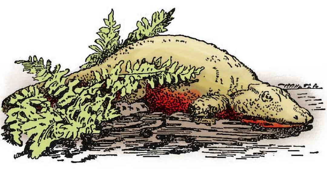 Labyrinthodonts looked like oversized salamanders (or undersized crocodiles) with short legs, large flat heads and a tail. They are named after the folding enamel pattern of their teeth, which looks like a maze or labyrinth. Teeth from the Labyrinthodont are often the only part of the animal to fossilise. Their teeth also suggest they were carnivores as the labyrinth pattern makes them stronger. Useful when snapping shut on prey.