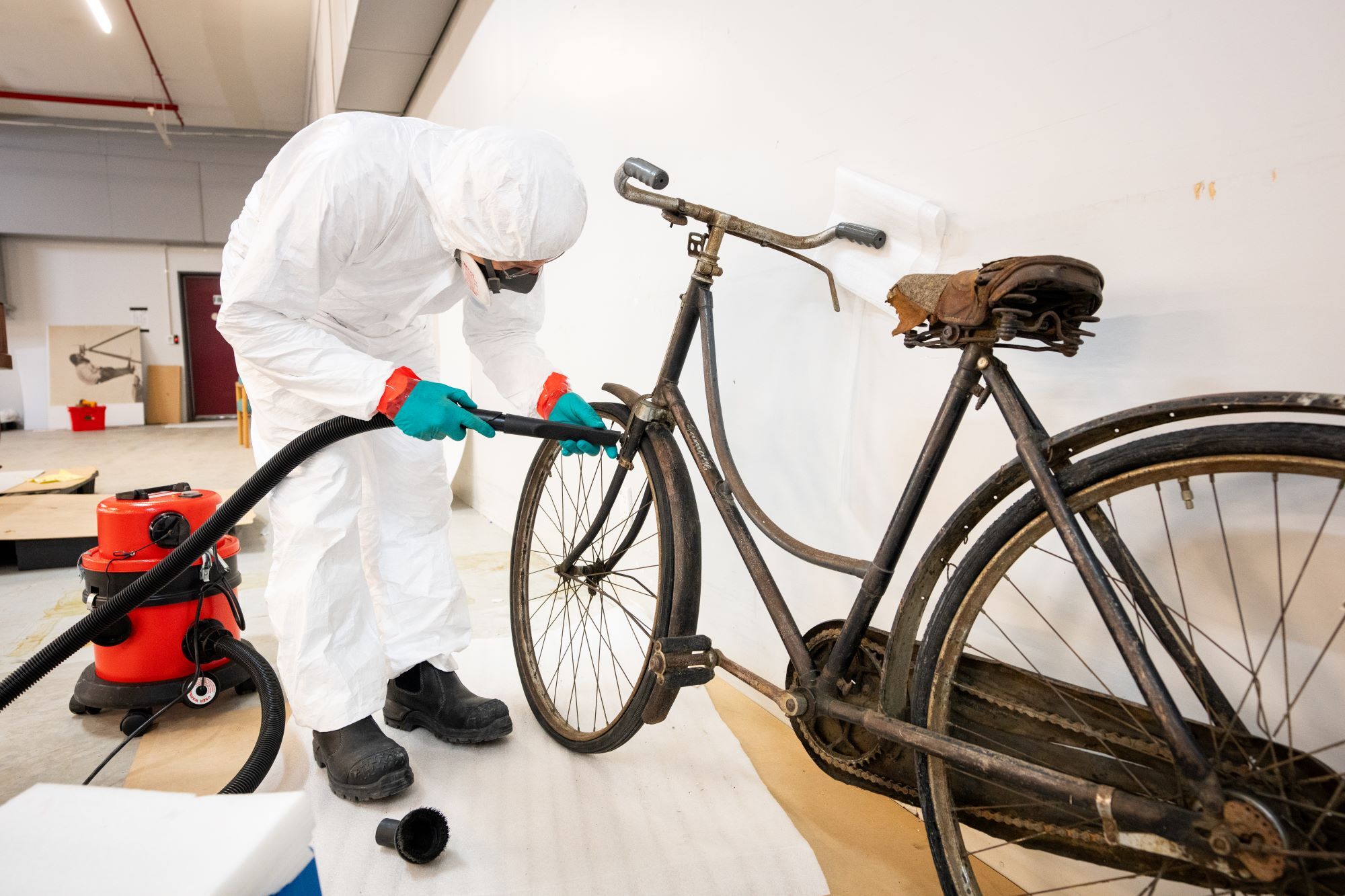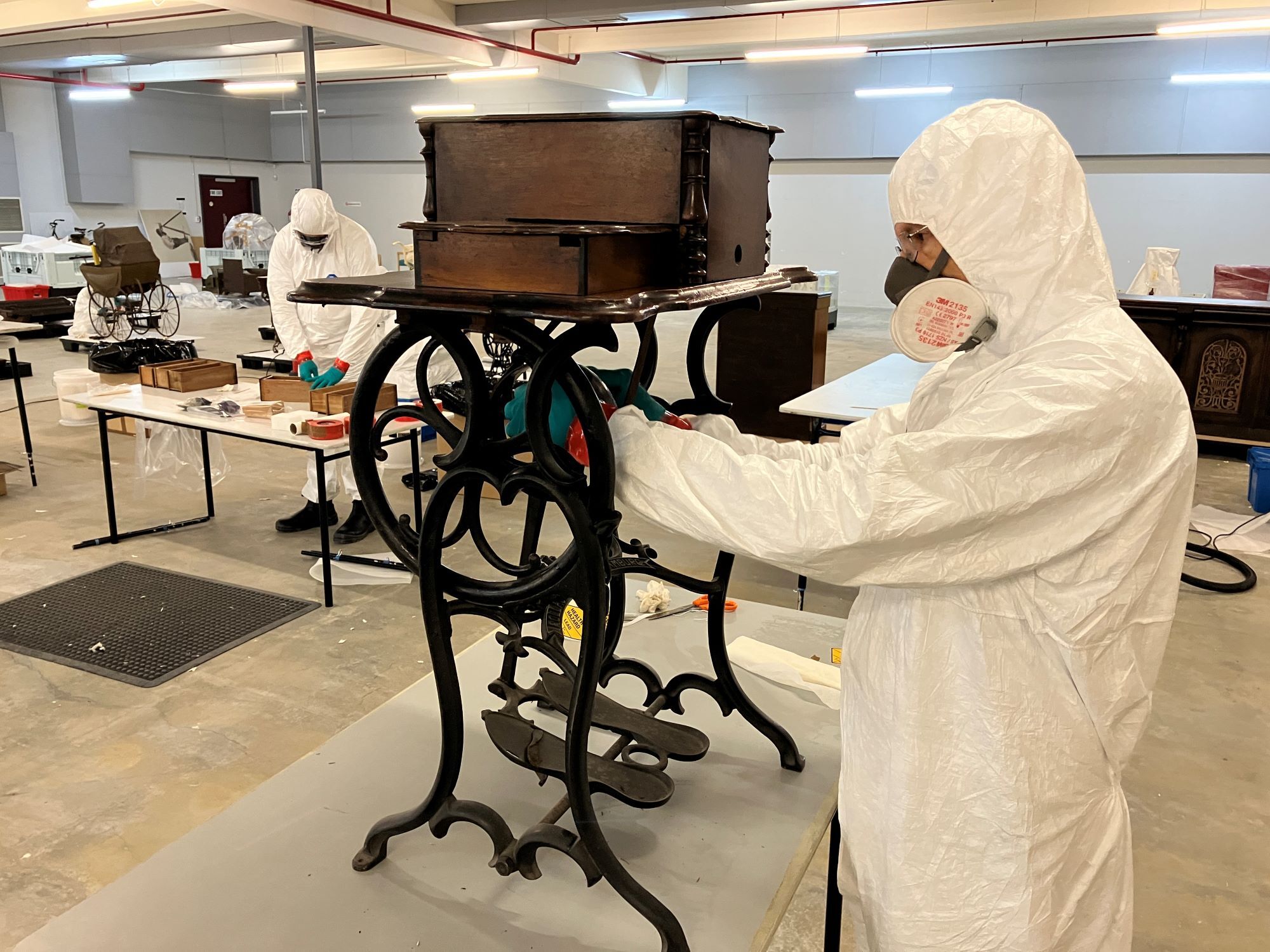 Over 3 months, Museum staff cleaned about 750 large objects and hundreds of boxes containing smaller objects. We used paper towels soaked in a cleaning agent specifically made for removing metal contaminants from surfaces. For objects made of textiles and rough metal we used a specialised vacuum cleaner to capture the tiny particles of lead dust.