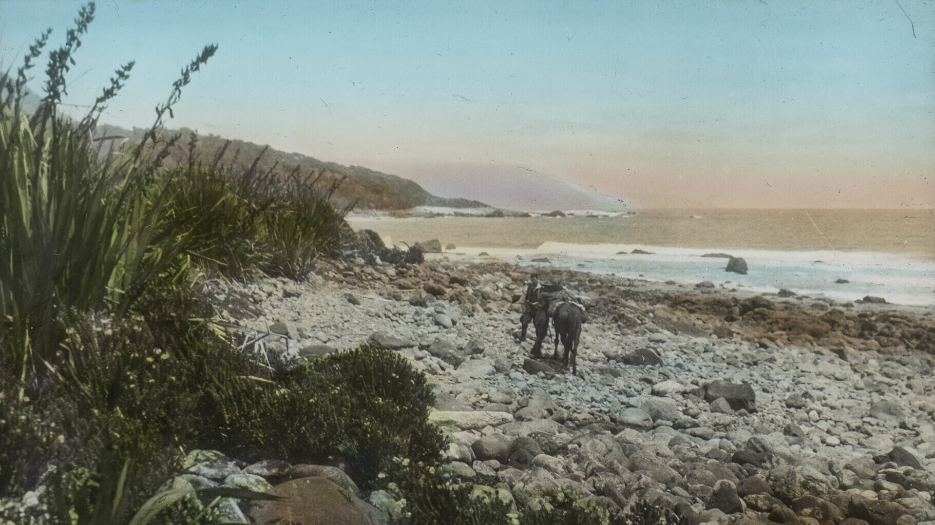 The party left Makarora on 27 May 1930 and were away for 11 weeks, travelling over Haast Pass, through Okuru and then down to the Coast via the Cascade Valley. The boulder beaches are difficult for both people and horses and it was probably with some relief that they reached Martins Bay. The group spent some time in the Hollyford and Pyke valleys before the Auckland Weekly News photographer left for Queenstown. The remaining two men wanted to travel further south and were joined by Martins Bay resident Malcolm McKenzie.